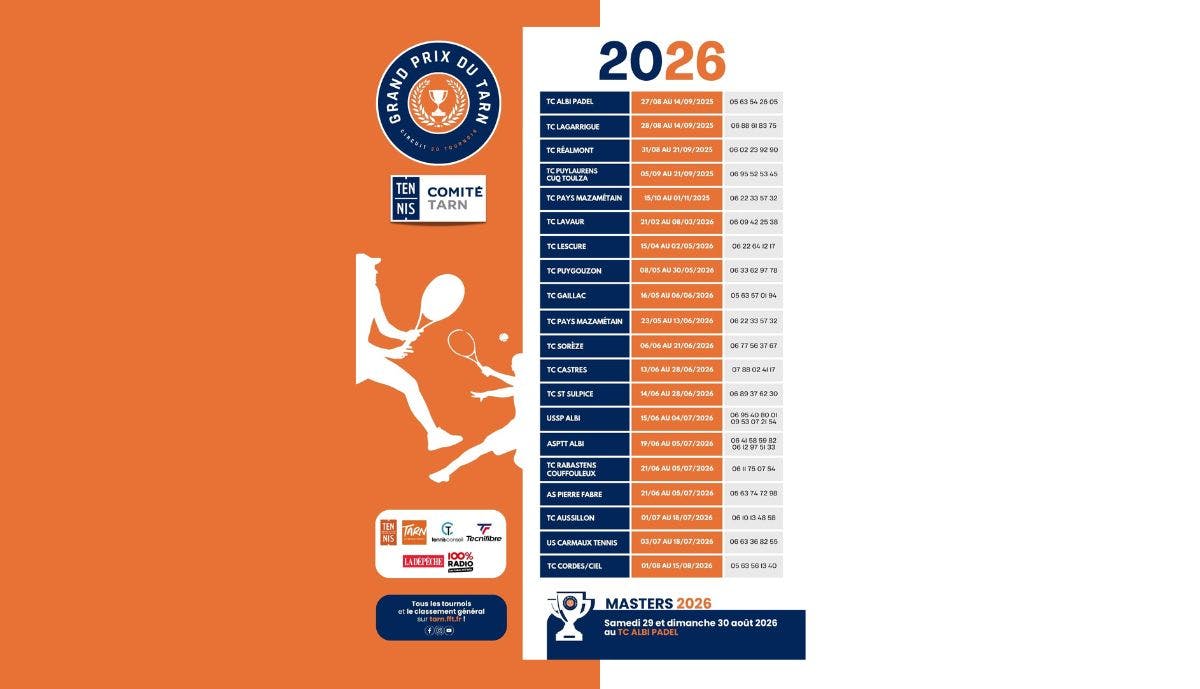 L'édition 2026 du Grand Prix de Tennis du Tarn est lancée ! 20 tournois sont proposés par les clubs à travers le département. C'est le TC Albi Padel qui commence à partir du 27 août (jusqu'au 14 septembre) suivent le TC Lagarrigue (du 28 août au 14 septembre), le TC Réalmont (du 31 août au 21 septembre) et le TC Puylaurens Cuq Toulza du 5 au 21 septembre... A l'Automne, Mazamet organise son tournoi du 15 octobre au 1er novembre... une petite coupure puis les compétiteurs pourront aller jouer du côté du TC Lavaur en février (du 21 février au 8 mars).