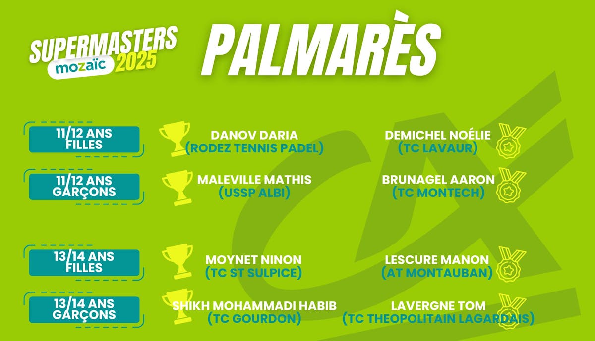 Ce dimanche 28 septembre ont eu lieu les SuperMasters Mozaïc à l’USSP Albi. Les meilleurs jeunes aveyronnais, lotois, Tarn et Garonnais et tarnais se sont défiés sur les terrains en terre-battue.